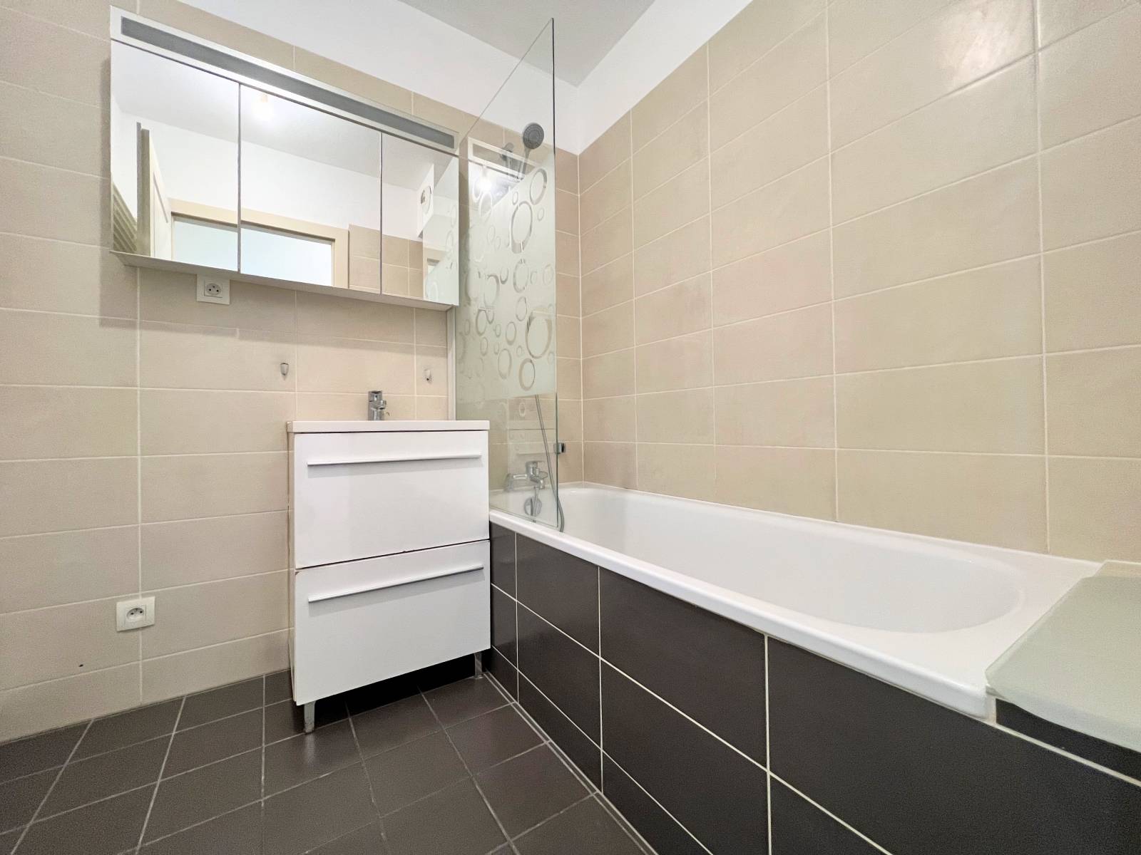 La salle de bain comprend une baignoire, un meuble vasque et un emplacement pour la machine à laver.