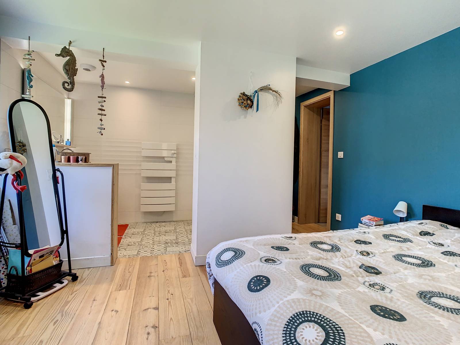 Au 1er étage, une chambre, un espace bureau ainsi qu'une deuxième salle de bain avec wc.