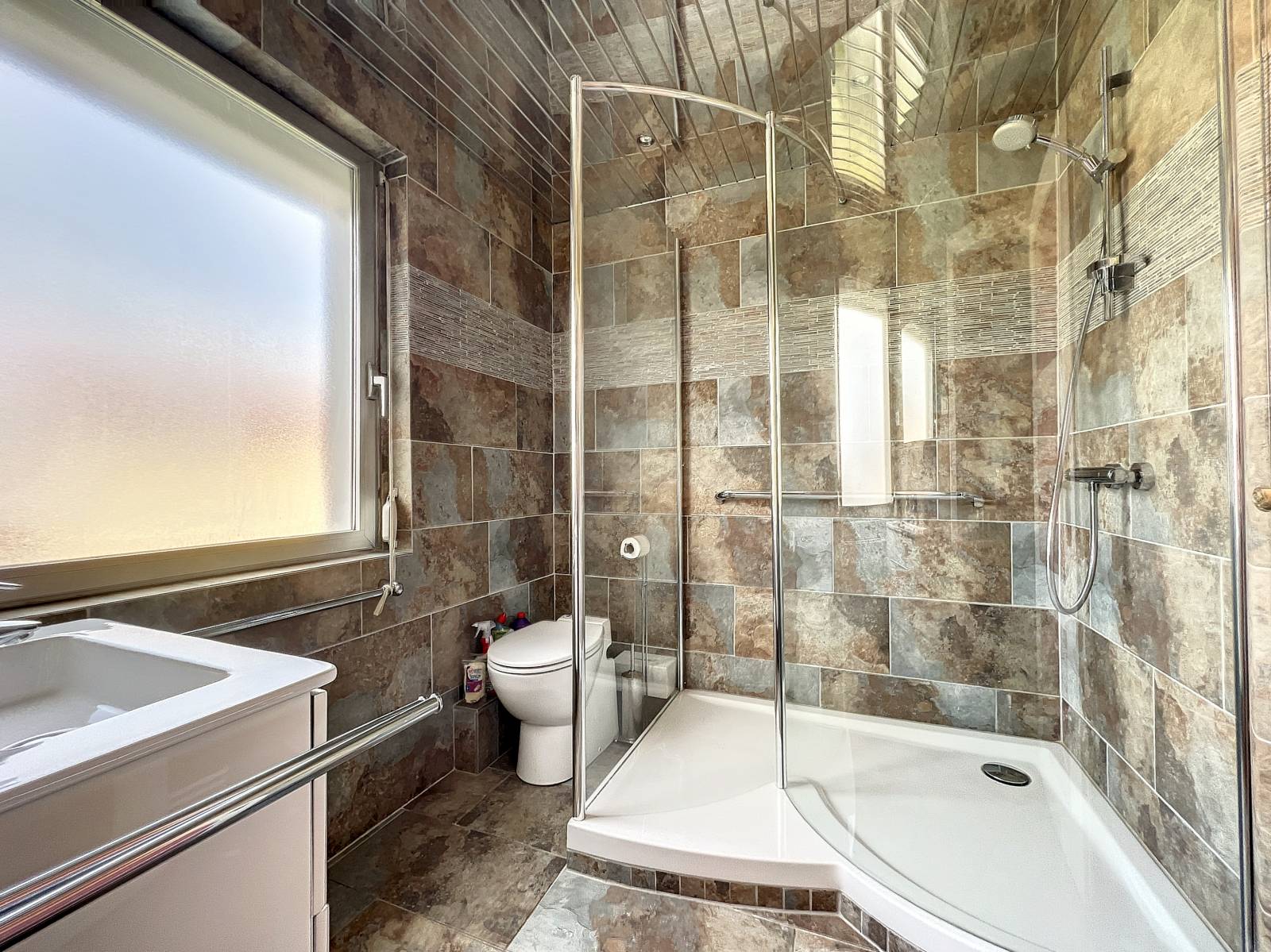 L'étage de la maison dispose de deux chambres lumineuses, d'une salle de bain avec douche et d'un WC sanibroyeur. Les espaces de vie sont bien agencés et offrent une belle luminosité naturelle.