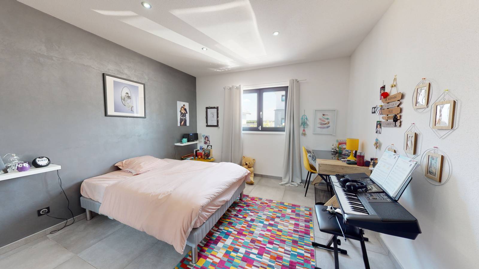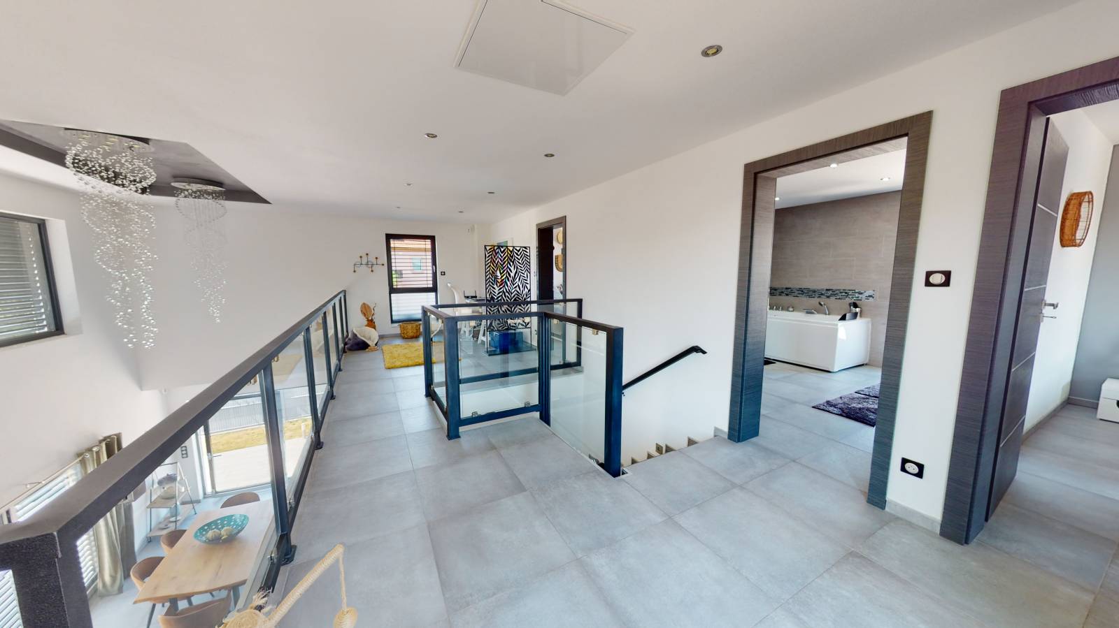 À l'étage, une mezzanine lumineuse offre un espace idéal pour un bureau, avec un accès à une terrasse de 25 m². Deux chambres spacieuses de 12 m² chacune, sans mansarde, ainsi qu'un placard, offrent des espaces de vie confortables. Une grande salle de bains vous invite à la détente avec une baignoire balnéo, une douche à l'italienne et un meuble double vasque. Un WC supplémentaire se trouve également à cet étage.